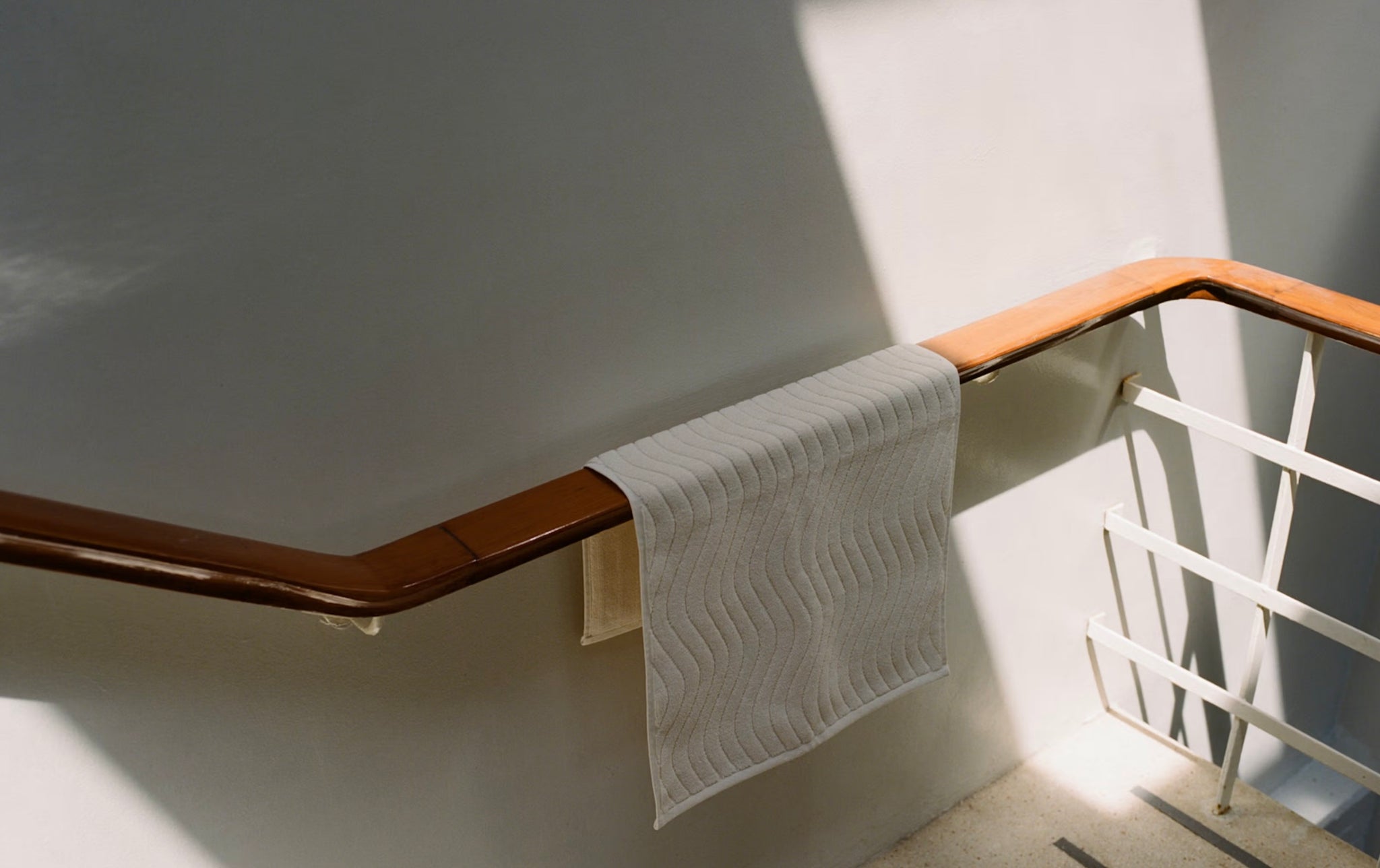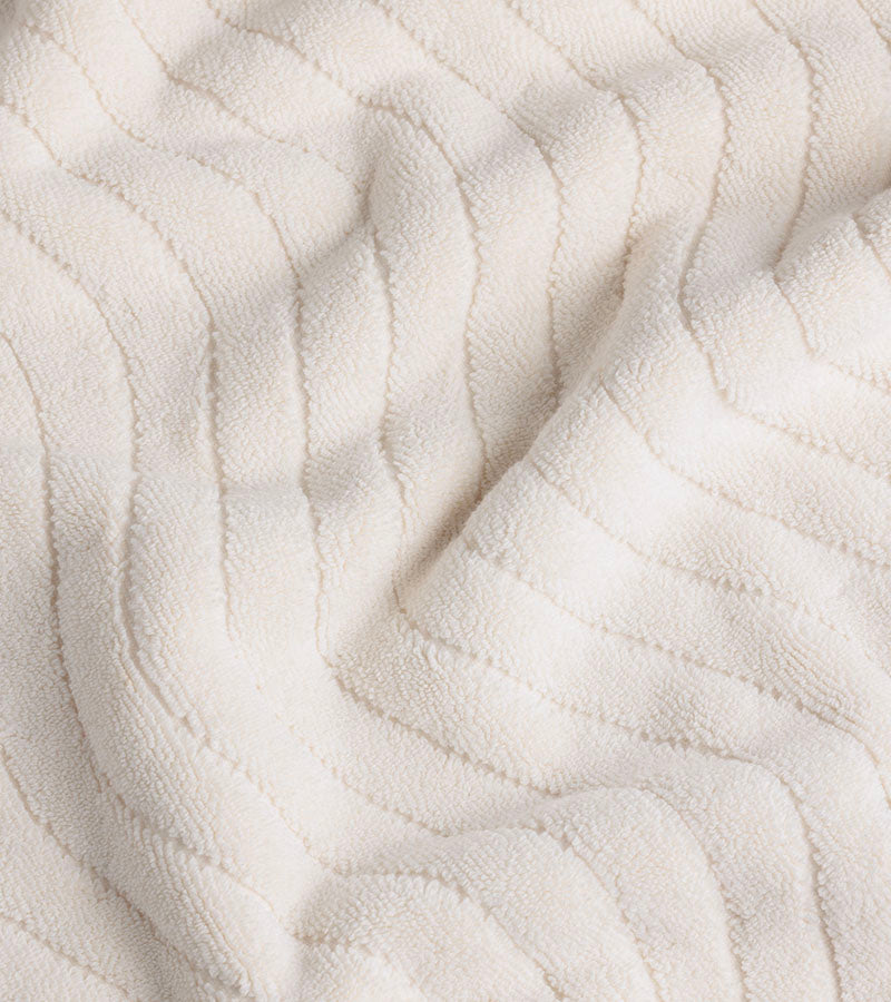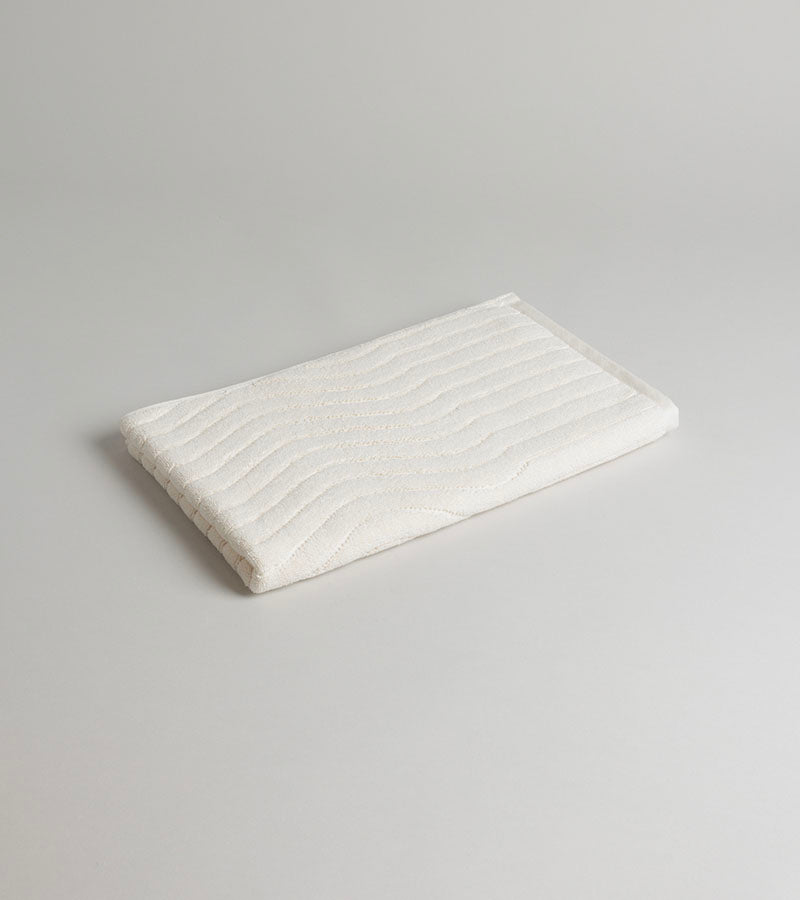The Eyre Bath Mat Ivory from Baina is made from 100% organic cotton and features a wiggled, ribbed texture inspired by the ripples of skimmed water. Its repetitive, calming design complements any minimalist bathroom.