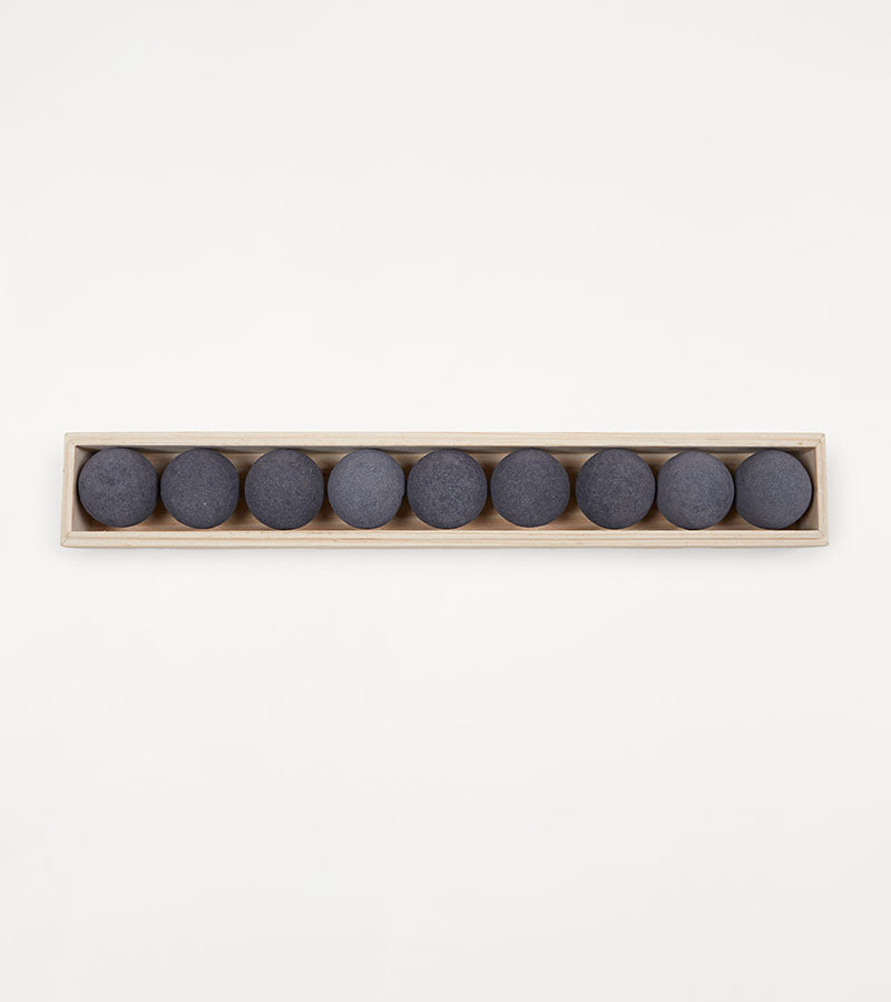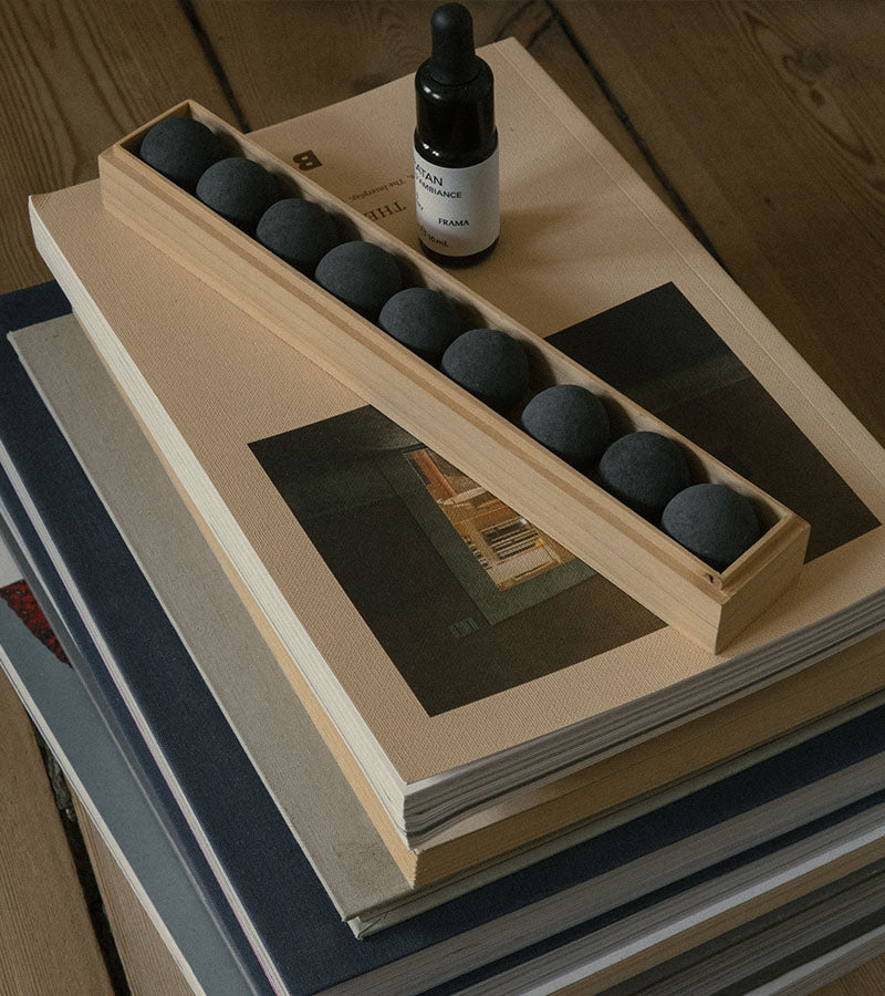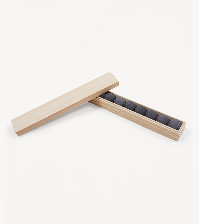 The From Soil to Form Charcoal from Frama is a natural room diffuser containing nine spheres made from soil and air-enriching charcoal. Encased in a pinewood box, the spheres softly diffuse the applied oil's fragrance while helping to purify the air and balance the room's humidity.