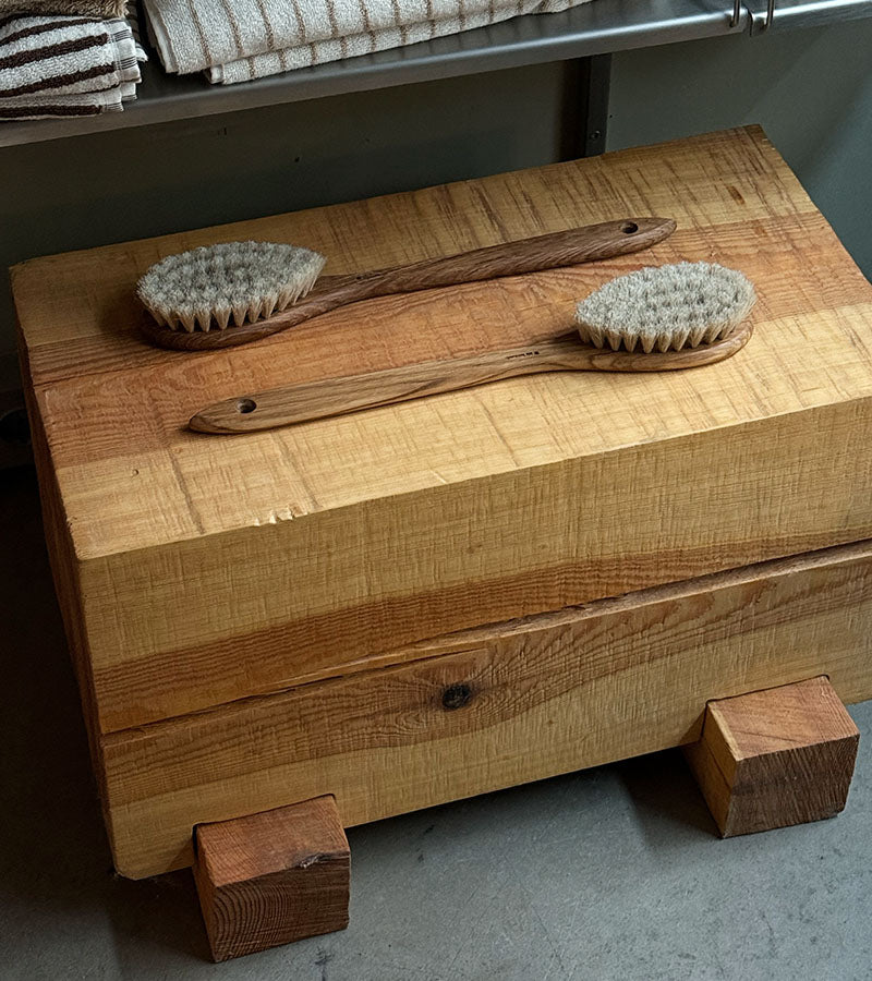 The Bath Brush With Handle from Iris Hantverk. Bath brush in oak and horse hair with handle. Horse hair is an excellent material in bathing brushesbecause it is soft and pliable while it is sturdy and durable and has a certain elasticity. Along with a good soap it gives a soft and comfortable lather for a perfect cleaning. Allow the brush to dryhanging or standing on the horsehair so that the water is transported away from the wood that is more sensitive to moisture.