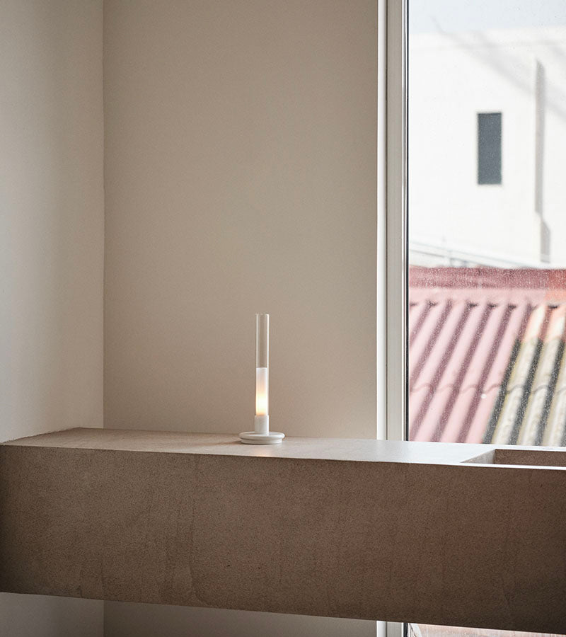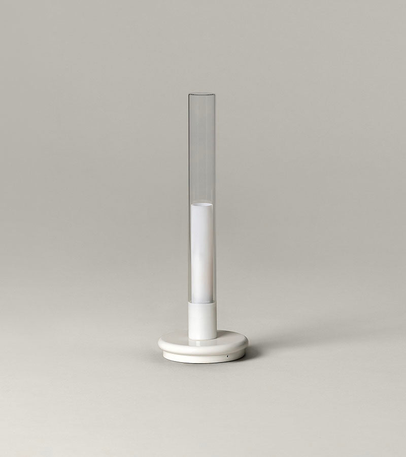 The Sylvestrina White portable table lamp by Santa & Cole is an elegant and modern lamp with subtle references to traditional oil lamps. Freed from oils, kerosene or cords, and powered by an efficient rechargeable battery, Sylvestrina, very robust in its delicacy, comes in handy for every occasion. Simply press the outer tube down to activate the switch, adjusting accordingly, to full, medium or zero strength. It is charged by induction, and its light really is that of an oil lamp.